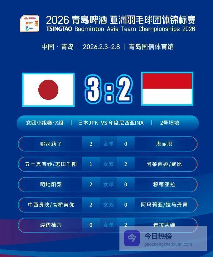 日本队和印尼队那场,打满了五盘。 两边儿都拼了,比分交替上升,谁也甩不开谁。 关键的第五盘,日本的双打组合中西贵映和高桥美优站了出来,她们拿下了制胜一分,日本队这才以3比2的比分险胜过关。 赢得是真不容易,汗都流了一地。