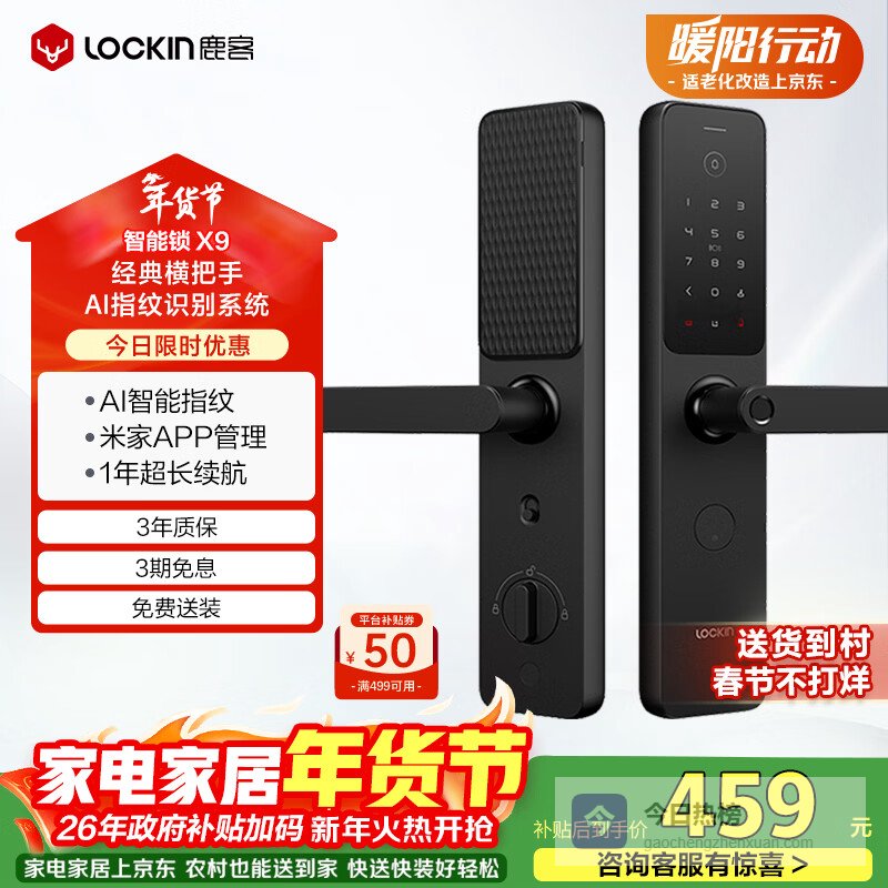 【京东自营】鹿客智能门锁AI指纹识别系统一握即开APP智联指纹锁密码锁电子锁X9¥