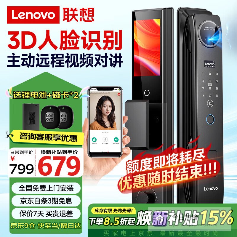 【京东自营】联想R20智能门锁指纹锁3D人脸识别智能锁入户门密码锁电子锁全自动可视猫眼家用防盗门¥
