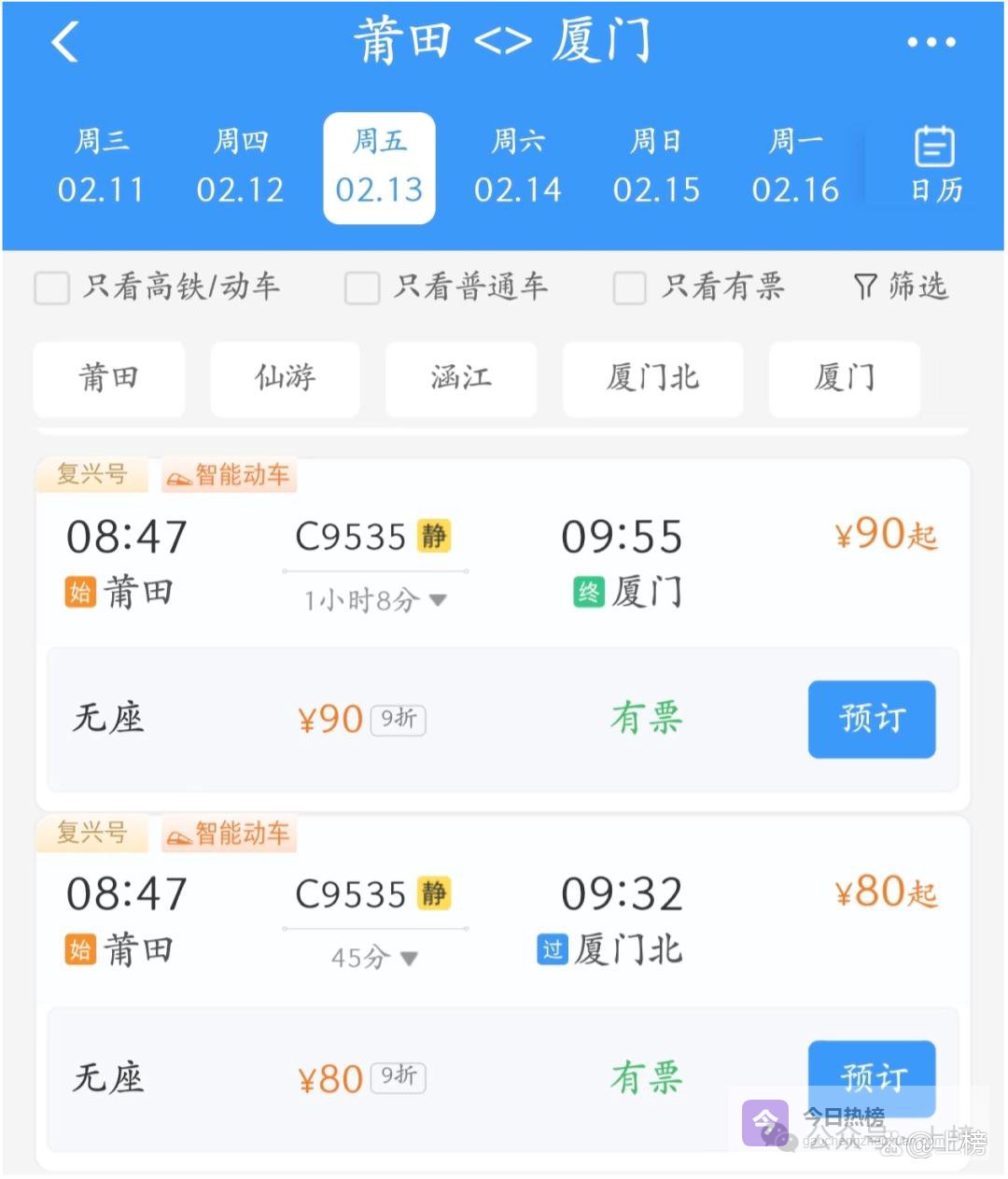 近日,在12306售票平台上,一班特殊的加开列车引起了旅客和铁路爱好者的注意。2月13日(及2月15日),由莆田站开往厦门站的C9535次复兴号智能动车组列车,售票页面显示仅有“无座”席位可供购买,这在全国高铁列车中实属罕见,迅速引发了关于“不对号入座”模式是否登陆福建的猜测。