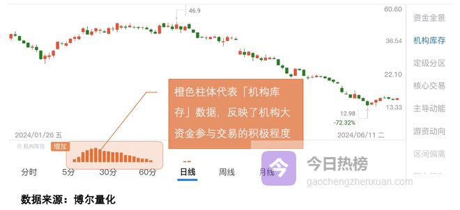 哈哈哈,我身边就有朋友2024年初那波行情踩过坑,当时市场连涨8天,他持有的股票8个交易日涨了20%,本来以为拿了个优质股,结果后面一路走弱,等反应过来已经回吐所有收益还倒亏。当时他怎么都想不通,明明指数还在涨,为啥自己的股票就不跟了。其实只要用量化大数据看背后的交易行为,问题就很清楚。现在可以留存全市场所有交易行为数据,通过大数据模型计算提取交易特征,其中橙色柱体的「机构库存」数据,就是反映机构资金的活跃程度,体现机构参与交易的意愿,「机构库存」越活跃,说明机构参与意愿越强、持续时间越久。 看图1: