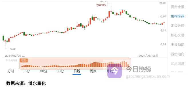 该股几乎和那波行情同步启动,「机构库存」的持续时间和行情持续的时间完全匹配,哪怕中间股票价格有波动,整体走势也一直向上,最终的表现非常可观,这就是机构持续参与带来的结果。