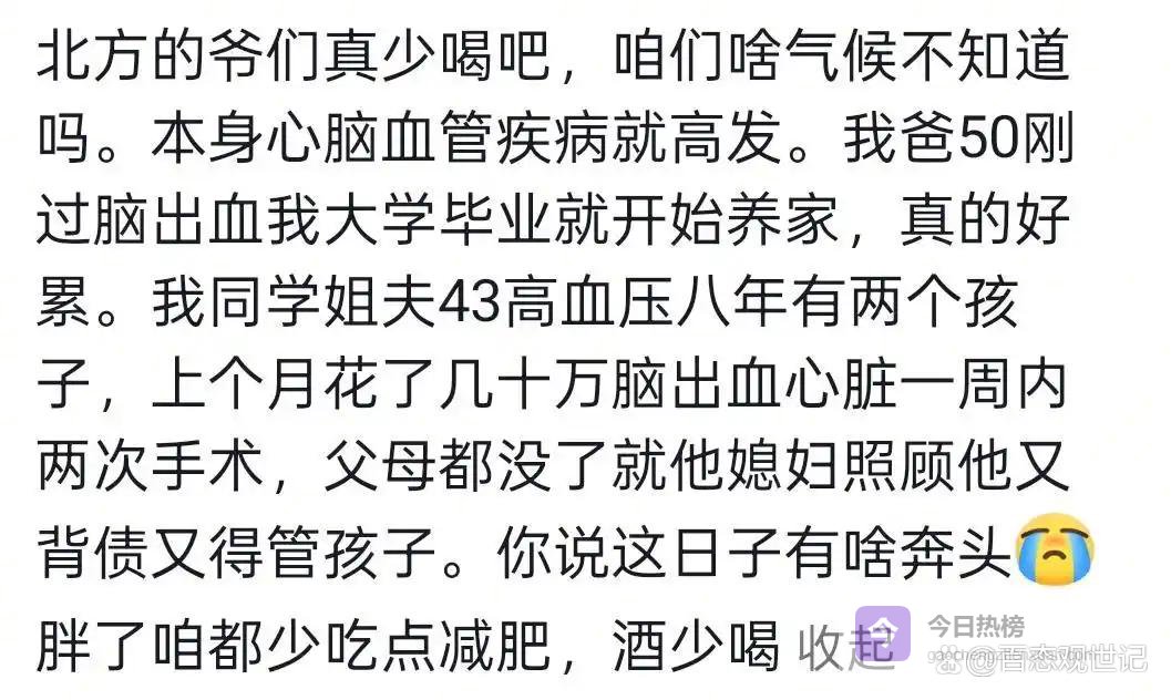 不少北方网友认为,冬季的严寒气候对心脑血管健康不利,若是再过量饮酒,隐患自然不容忽视。