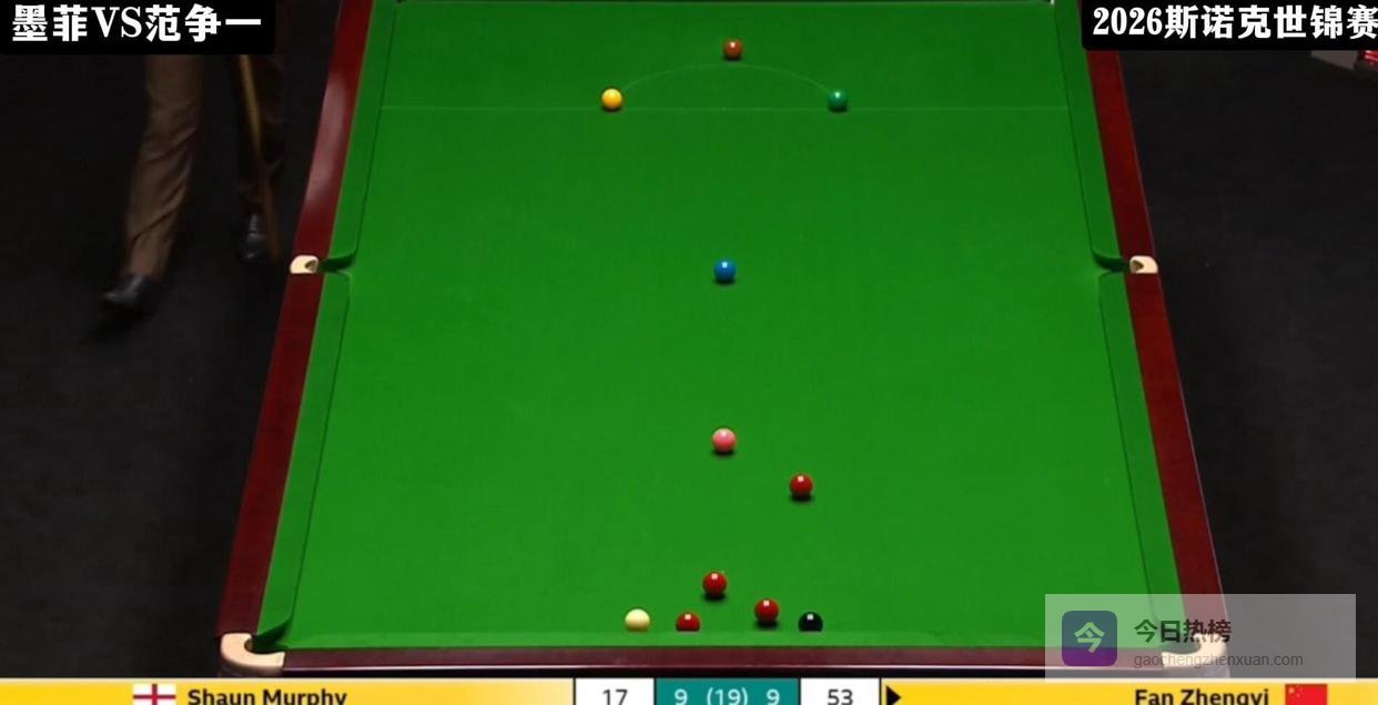 当墨菲在第17局以73-4获胜,以9-8拿到赛点时,许多人都以为比赛即将结束。 但范争一再次展现了强大的心理素质。 第18局,他顶住压力,多次上手得分,最终以99-4的悬殊比分拿下,硬生生将比赛拖入了最终决胜局。 决胜局的气氛紧张到令人窒息。 墨菲率先上手但只得到17分,范争一随后抓住机会,一杆拿下38分,取得了53-17的领先优势。 此时台面还剩4颗红球,其中两颗紧贴顶库,范争一只要再打进两颗红球就能完成超分,几乎触摸到胜利。