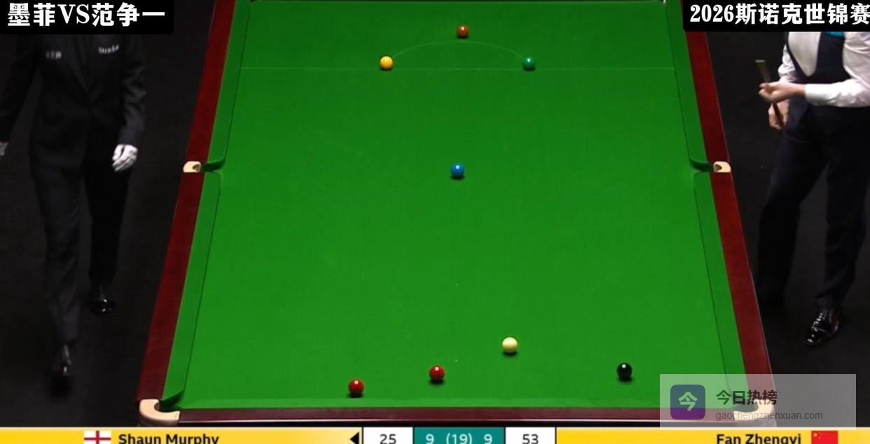 进入第二阶段,比赛的激烈程度有增无减。 第10局,范争一用一杆62分将总比分扳成5-5平。 随后双方进入了令人窒息的拉锯战,比分交替上升,谁也难以将优势保持超过两局。 第12局充满了戏剧性,双方战至争黑球,范争一在重压之下,以一杆漂亮的翻袋打进黑球,惊险拿下此局,将比分追至6-6平。 这种敢打敢拼的作风,正是他整场比赛的缩影。 第15局,范争一本有机会取得领先,却在击打一颗关键黑球时出现失误,墨菲抓住机会以8-7再次超出。