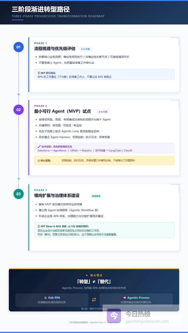 最后要强调:「转型」不等于「替代」。Agentic Process和传统RPA在相当长的时间内会并存——RPA处理确定性高的规则任务,Agentic Process处理非确定性高的判断任务,两者通过统一的编排平台协同运作。