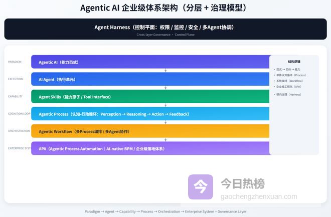 这七个概念构成了一个完整的Agentic AI体系:Agentic AI定方向(能力范式),AI Agent去执行(执行单元),Agent Skills打基础(能力原子),Agentic Process做核心(运作流程),Agentic Workflow做调度(编排形式),APA落地到企业(工程体系),Agent Harness保安全(治理控制)。