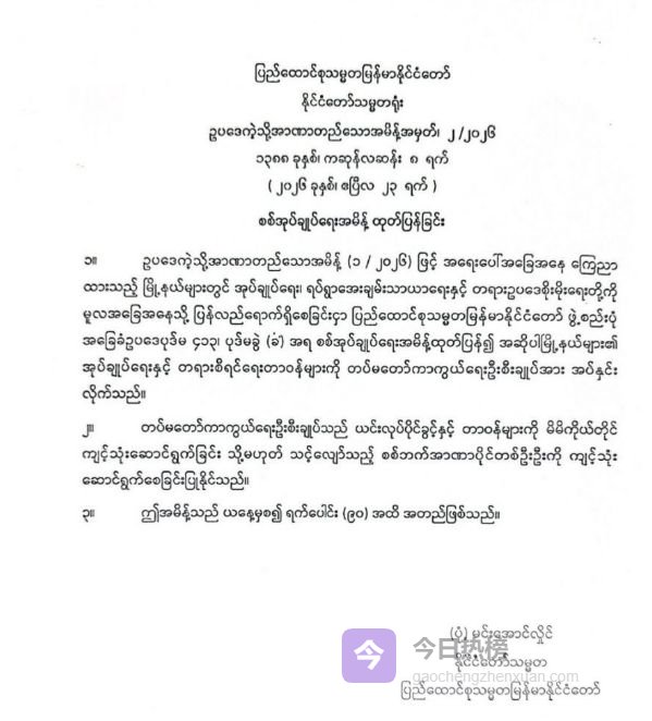 命令显示,依据此前第1/2026号命令,宣布实施紧急状态的镇区,为使行政、社区安宁及法治恢复正常秩序,依据《缅甸联邦共和国宪法》第 413 条及第 9 条(b)款,现宣布军事管制令,行政与司法职责移交国防军总司令行使。