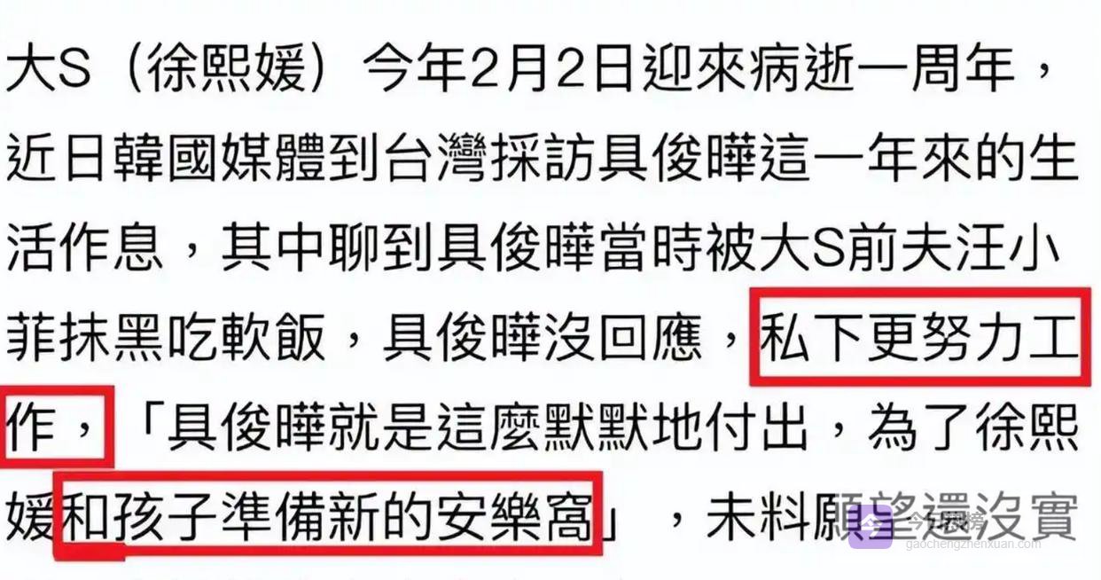 不久前,韩国电视台趁大s去世一周年的忌日,推出了一期有关大s和具俊晔的纪录片,在这档节目中,媒体不仅多次赞扬具俊晔的深情人设,还否认了他多年来贴在身上吃软饭的标签,甚至主持人还透露,具俊晔这么多年来一直在努力赚钱,就是为了给大s买一套新的房子