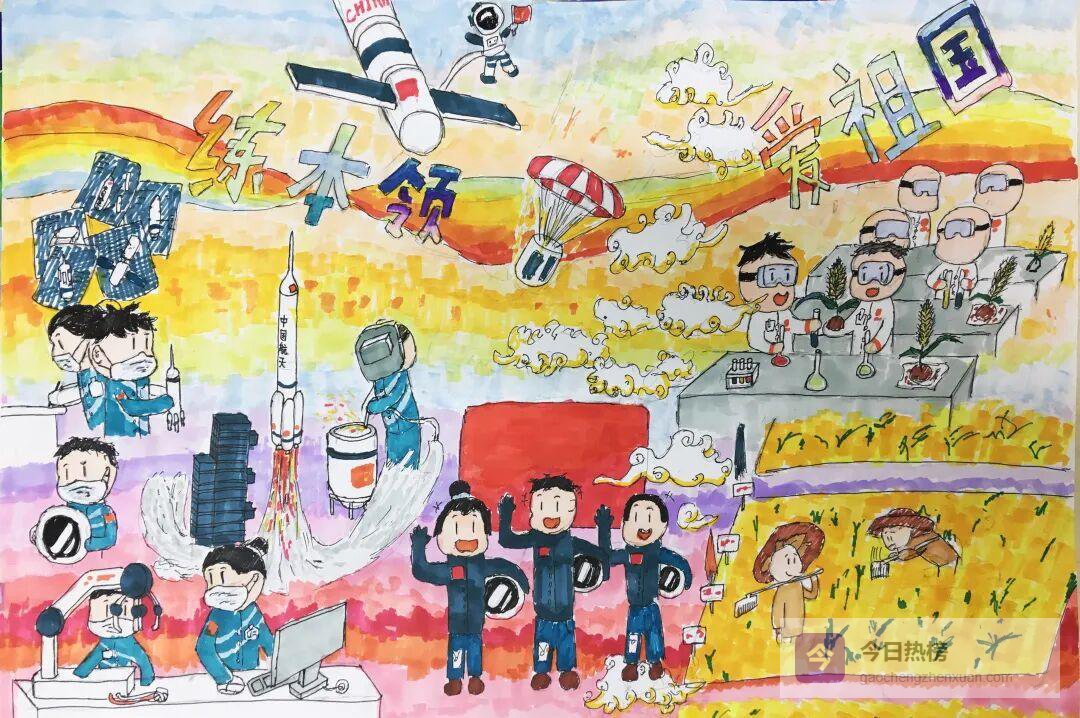 获奖美术作品《练本领 爱祖国》以写意与工笔结合的手法,展现少年儿童在党旗下练功、阅读、眺望远方的场景。画面传递出“练就过硬本领、报效祖国”的新时代心声,打动评委,赢得美术类铜奖。