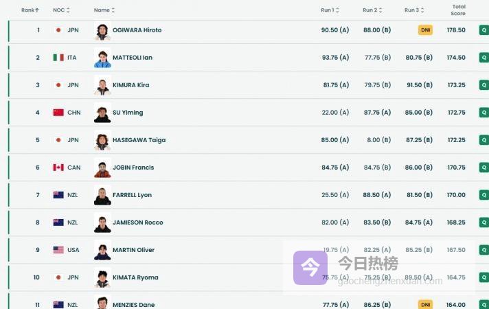 最终晋级名单显示,本次预赛第12名的成绩高达163分,意味着选手平均每跳需达到81.5分才能晋级。 四年前北京冬奥会夺冠动作1800度转体,在米兰仅能算“基础门槛”,预赛中已有9名选手成功完成1980度转体动作。 日本选手荻原大翔更以178.50分领跑,其训练中尝试的2340度转体被视为当前场地物理极限。