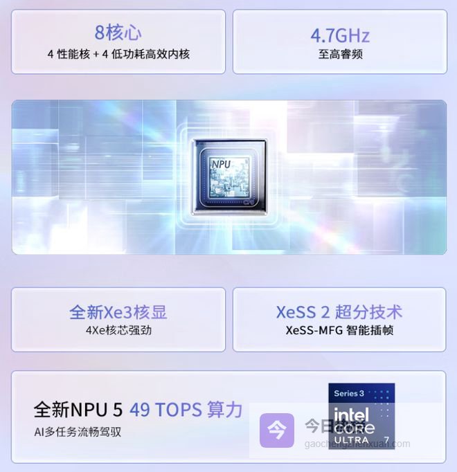 其采用了Xe3核显,4核心,最高频率2.5GHz,40 TOPS算力,还支持XeSS 2超分技术。同时具有NPU,49 TOPS算力。
