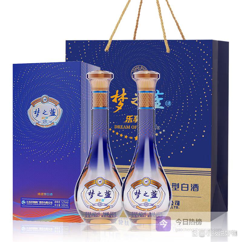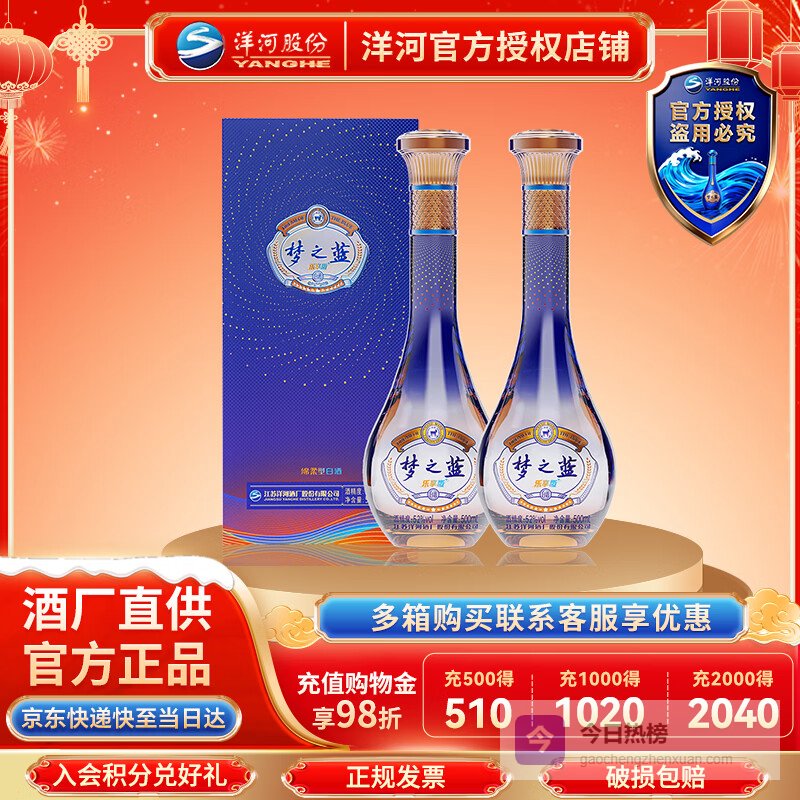洋河梦之蓝 高度白酒整箱 经典绵柔酒 喜宴佳品 马年送礼 52度 500mL 2瓶 乐享版 双瓶装¥