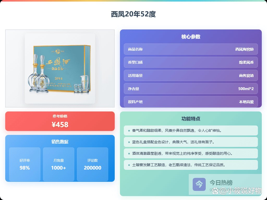 它融合了多种香味,口感多香复合,喝几口会感受到不同的香气缭绕。香气层次比较丰富,但不会抢了酒的柔顺感。实测这个香味挺协调的,倒是挺讨喜,适合喜欢多香调的白酒爱好者。