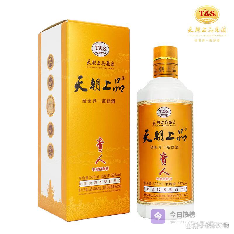 七、天朝上品这款天朝上品贵人酒采用绵柔酱香型酿造工艺,入口时能感受到醇厚且顺滑的酒体,清澈透明,酱香突出,整体口感较为细腻。酒精度为53%vol,算是相对较高的白酒,喝起来还算顺口,但对酒量有限的人来说,还是要注意适量饮用。