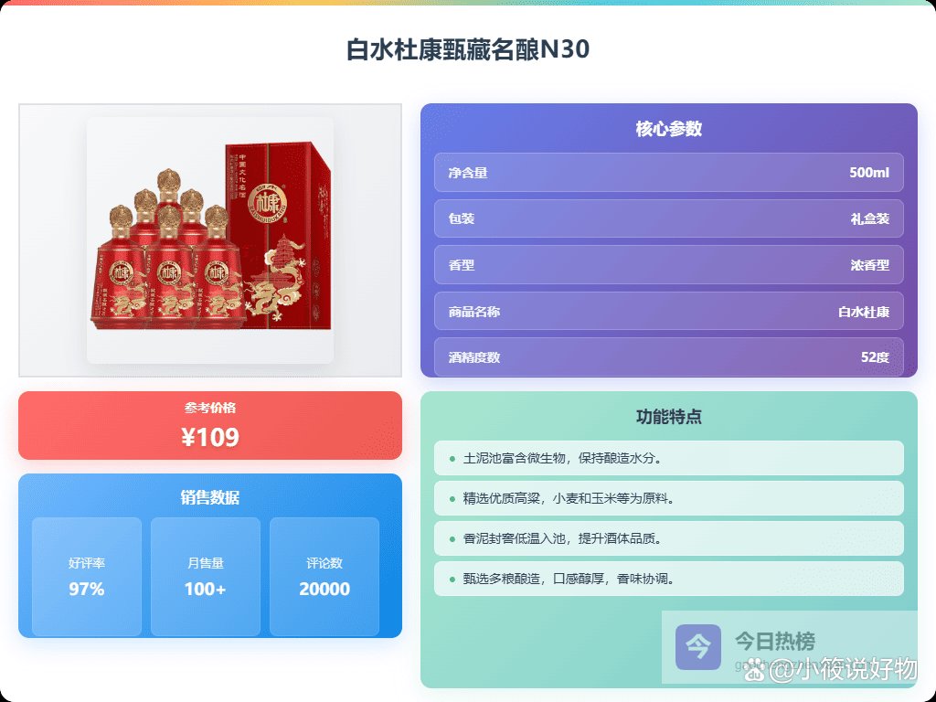 它采用了纯粮固态发酵和优质原料,比如龙井泉水和精选小麦、饱满高粱,确保酒质稳定。酿造过程精细,酒体绵甜净爽,尾香还挺持久,挂杯也明显,整体来说还行,品质算可靠。