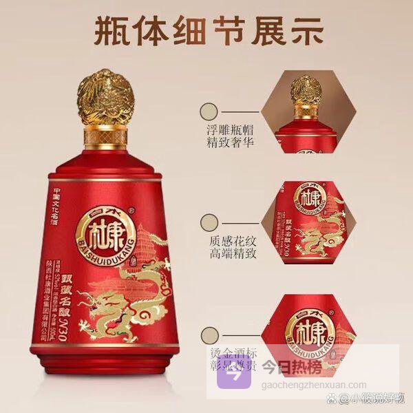 十、白水杜康白水杜康甄藏名酿N30采用多粮酿造工艺,精选优质高粱、小麦、玉米等原料,结合传统固态发酵技术,确保酒体纯正、香气浓郁。使用山泉水和香泥封窖,能够保持水分和微生物的活性,令酒香更加醇厚持久。其色泽清澈无色,口感绵柔顺滑,喝起来既香又不易烧喉。