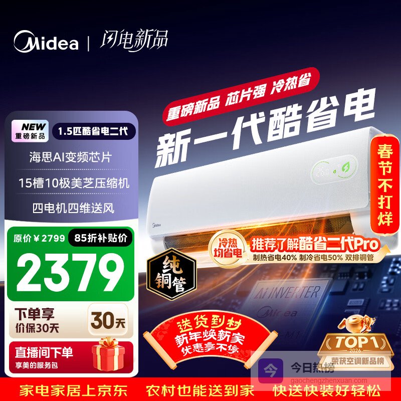 【京东自营】美的空调酷省电二代大1.5匹新一级能效变频冷暖纯铜管2026款空调卧室挂机国家补贴KFR¥