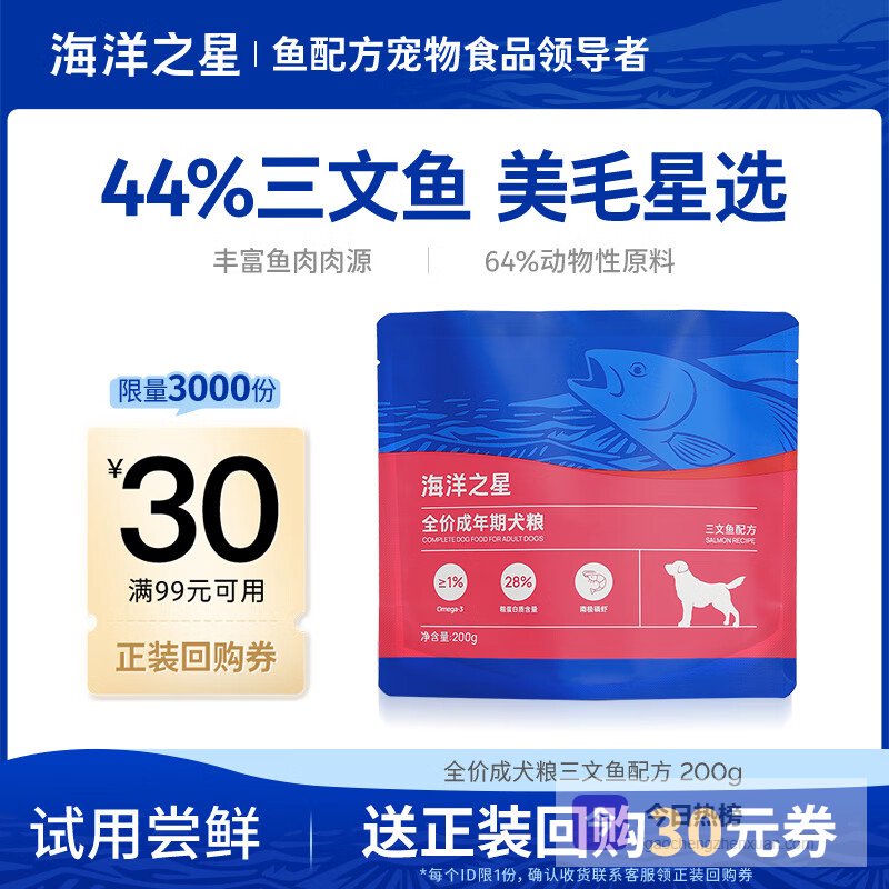 【京东自营】海洋之星三文鱼中小型大型犬狗粮金毛比熊边牧狗粮成犬小颗粒试吃200g¥