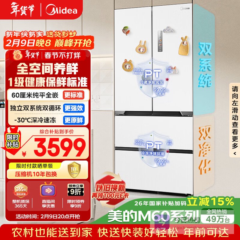 美的(Midea)M60超薄424法式五门多门平嵌一级能效以旧换新家用冰箱变频风冷无霜BCD-424WFPZM(E)底部散热¥