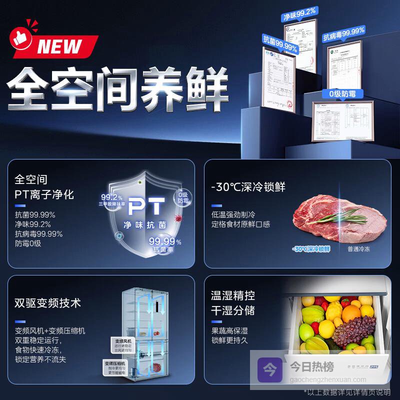 1️⃣ 双系统独立循环冷藏冷冻双蒸发器设计,彻底杜绝串味问题。冷冻室达到-32℃深冷速冻,三文鱼等海鲜锁鲜效果媲美专业冷柜。冷藏区特设干湿分储抽屉,虫草等珍贵食材可单独调节湿度。