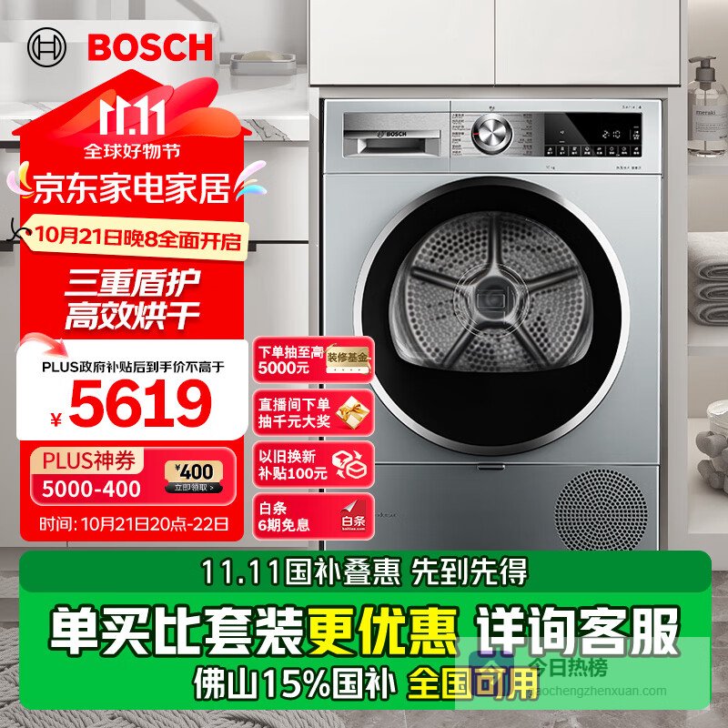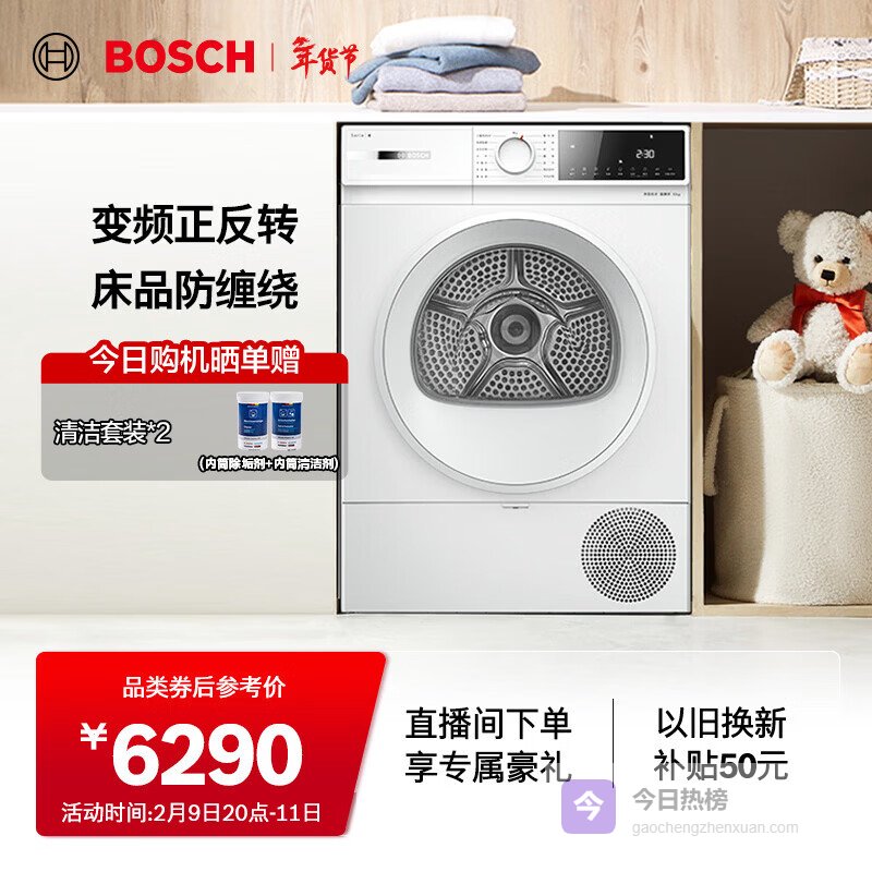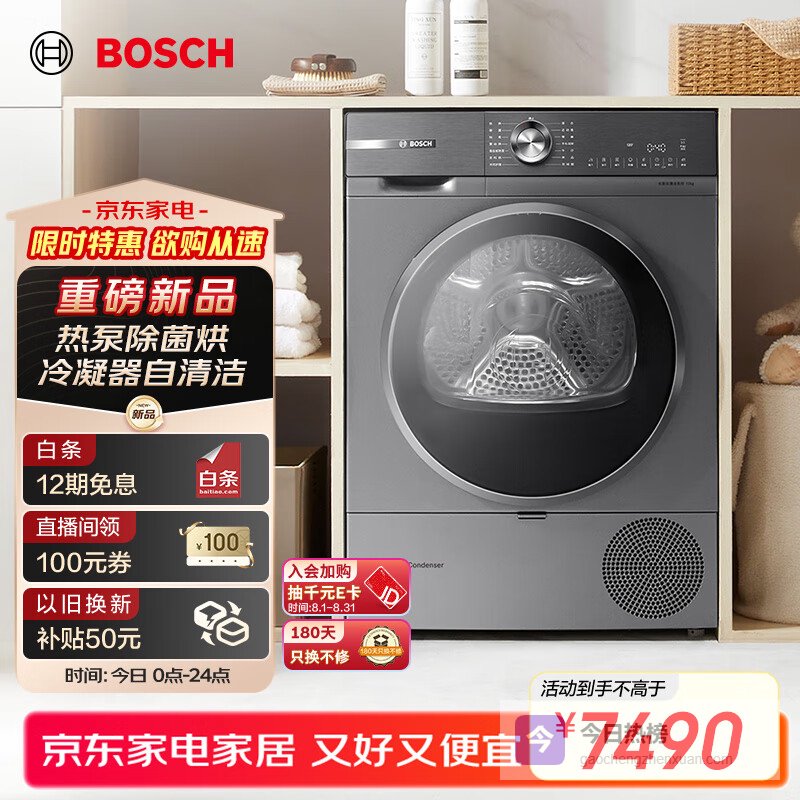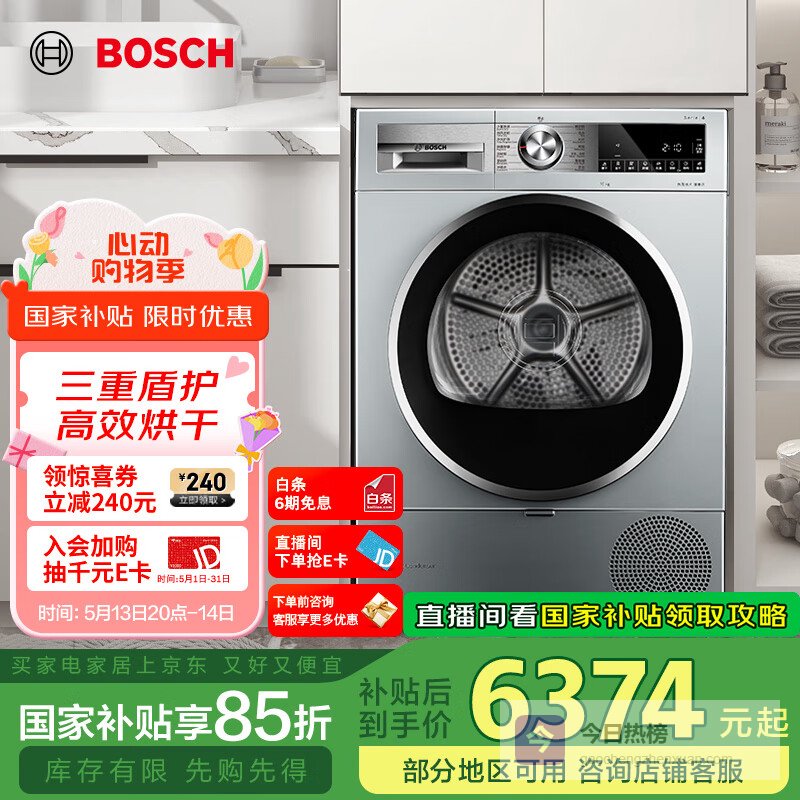 【京东自营】博世【papi推荐】6系烘干机家用10KG大容量热泵干衣机除菌除螨自清洁变频WQA254¥