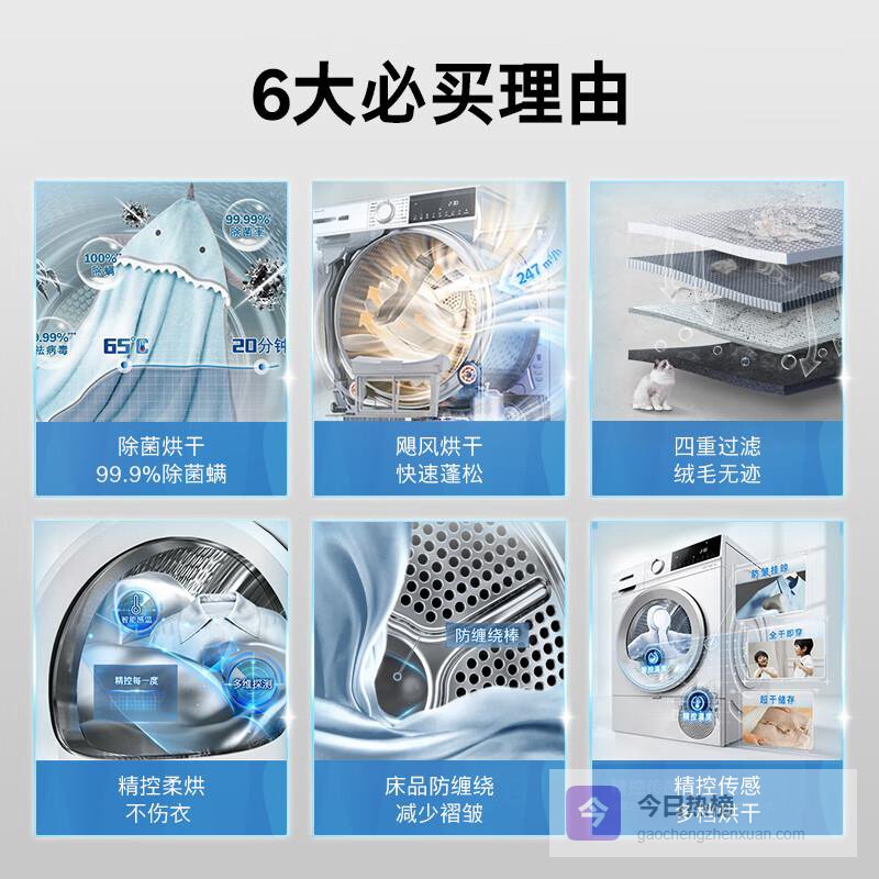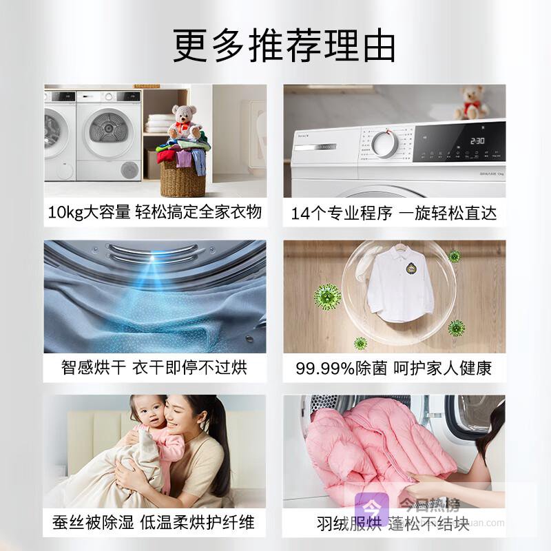 1️⃣大容量设计:齐全的10公斤烘干能力,适合家庭用户一次性处理大量衣物,节省宝贵的时间和精力。无论是换季大清洗还是多件衣物同时处理,轻松应对,大大提高了生活效率。