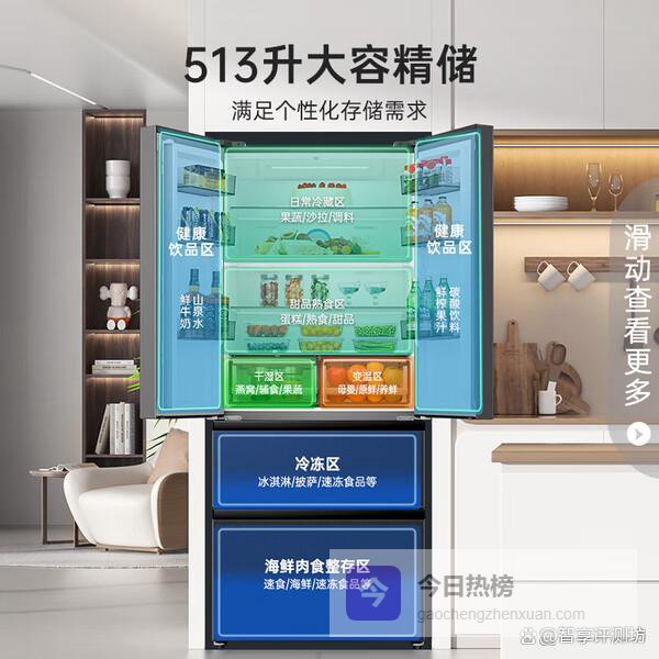 第2款:容声BCD-513WD18MP513L的容量算是挺能装的,冷藏室297L,冷冻室185L,还有一个31L的变温区,一家人的食材基本都能安排明白。干湿分储这个设计确实不错,能给不同的食物提供更合适的存储环境,像水果蔬菜啥的,保鲜效果会更好。而且它还带蓝光SPA养鲜,号称能让蔬果保持7天新鲜,这个回头得好好试试。