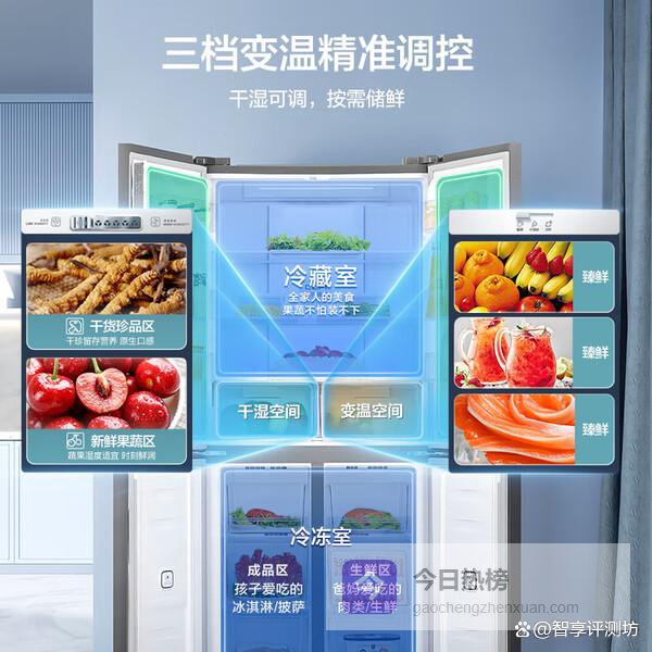另外,它还支持干湿分储和三挡变温,可以根据食材类型设置不同的存储环境。还有变频风冷无霜,不用手动除霜,省事不少。而且它还是一级能效,用起来也比较省电。