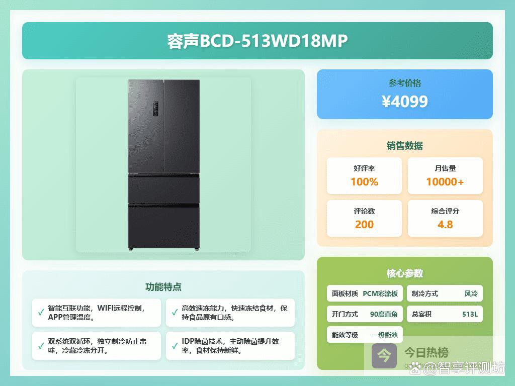第2款:容声BCD-465WD18FP容声这款冰箱,465L的总容量确实挺能装的,冷藏区、冷冻区分区明确,还有个变温区可以灵活调整。对于三口之家或者平时喜欢囤货的朋友来说,空间基本够用。而且它这个90度直角开门设计倒是挺贴心的,能更好地适应各种厨房布局,嵌入式安装也更方便,不会显得突兀。