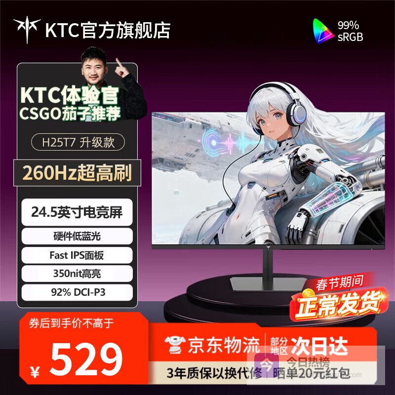 KTC高清电竞显示器窄边框 护眼不闪屏 游戏高刷电脑显示屏幕 H25T7 升级款 24.5英寸 260Hz¥