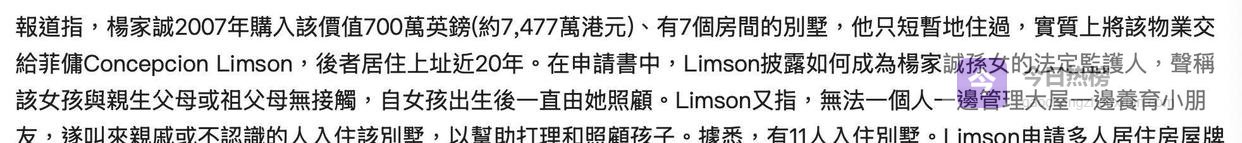 说起来有点匪夷所思,这名菲佣声称自己是杨家诚孙女的监护人,但那女孩和亲生父母、祖父母都没有联系,这事挺令人迷惑的。到底那女孩是不是杨家诚的孙女还不得而知,不过查资料的话,杨家诚在1999年和第一任老婆生了个儿子杨梓骢,现年28岁,所以他有孙女也不奇怪,只不过奇怪的是,这孩子为什么不和父母、祖父母联系,还自己一个人在英国生活,这点倒挺让人搞不懂。再说了,这名菲佣在这里住了快20年,只负责照看一个孩子,居然还说照顾不过来,要求帮手,这就说不过去了。