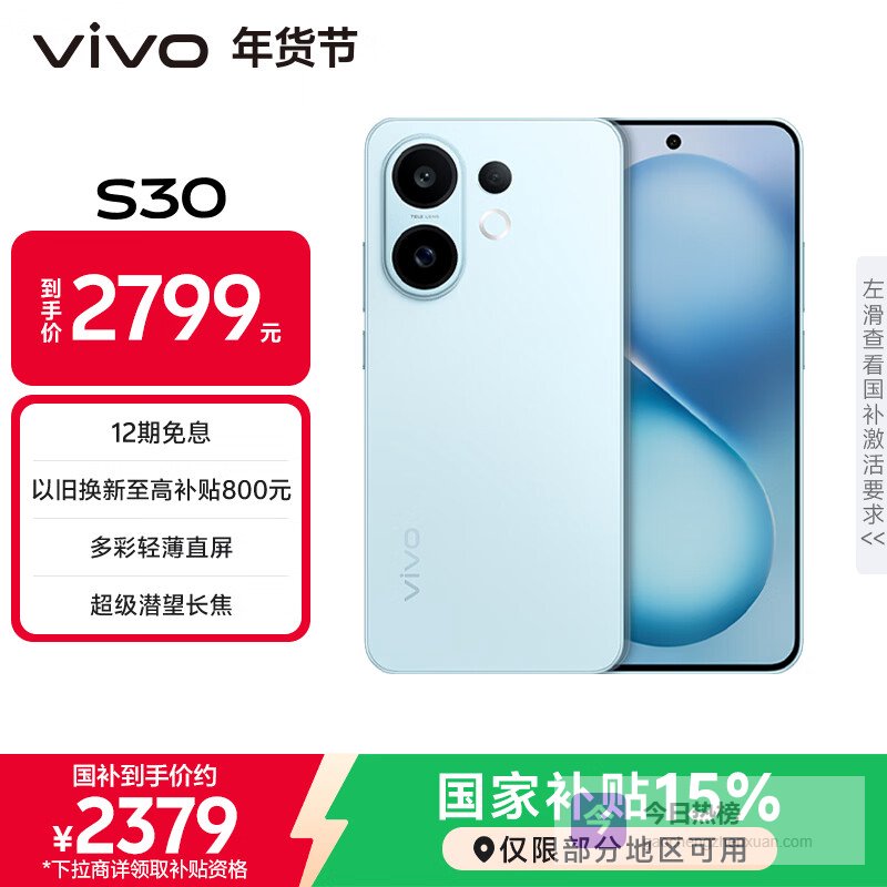 vivo S30 12GB+512GB 薄荷青 国家补贴 多彩轻薄直屏 超级潜望长焦 学生 live图 AI手机¥