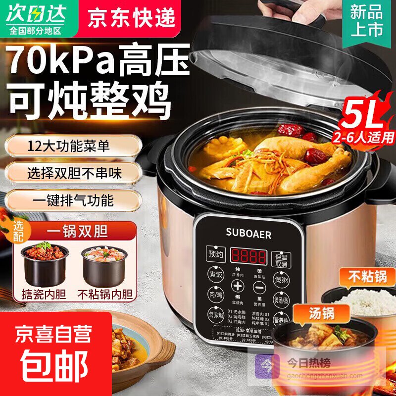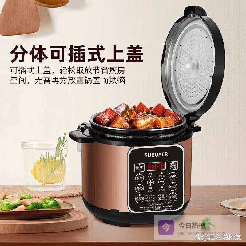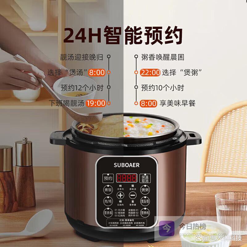 第2款:SUBOAER电压力锅这电压力锅5L大容量,一家人吃饭是真没问题。更绝的是它一锅双胆,米饭、炖肉分开搞,味道不串,体验感确实好。而且它还挺智能,预设了不少菜单,像什么煲汤、炖肉、煮饭,基本都能搞定,厨房小白也能做大餐。