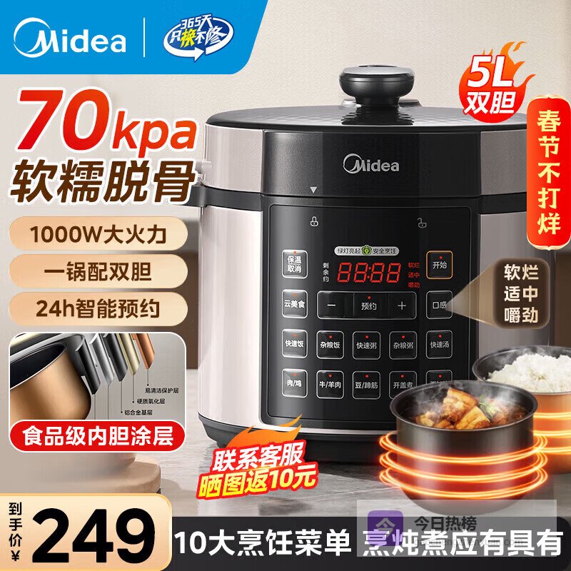 美的(Midea)电压力锅高压锅5L大容量双内胆家用全自动智能预约煲汤70kpa高压快煮开盖一键排气多功能电饭煲 【70kpa】配双胆 5L¥