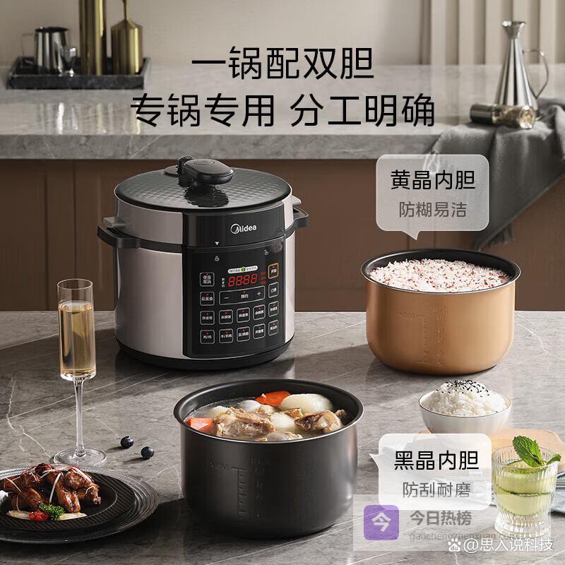 第1款:美的5L电压力锅这电压力锅挺贴心的,直接给了俩内胆,一个黄晶,一个黑晶。黄晶的用来煮饭煮粥,官方说有5层合金,煮出来的米饭香甜软糯还不粘锅,易清洗这个确实深得我心。黑晶的就专门用来煲汤炖肉,说是耐刮花耐腐蚀,用久了也亮锃锃的,更好入味。这样饭菜不串味,专锅专用,挺讲究。