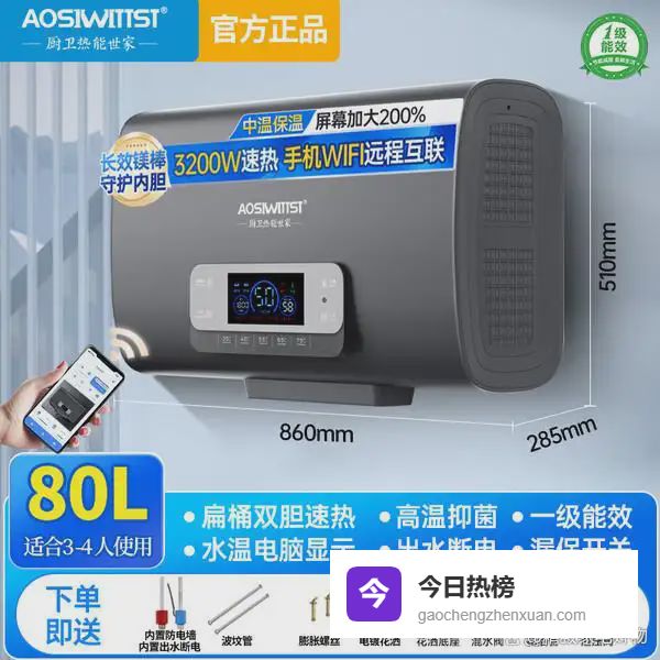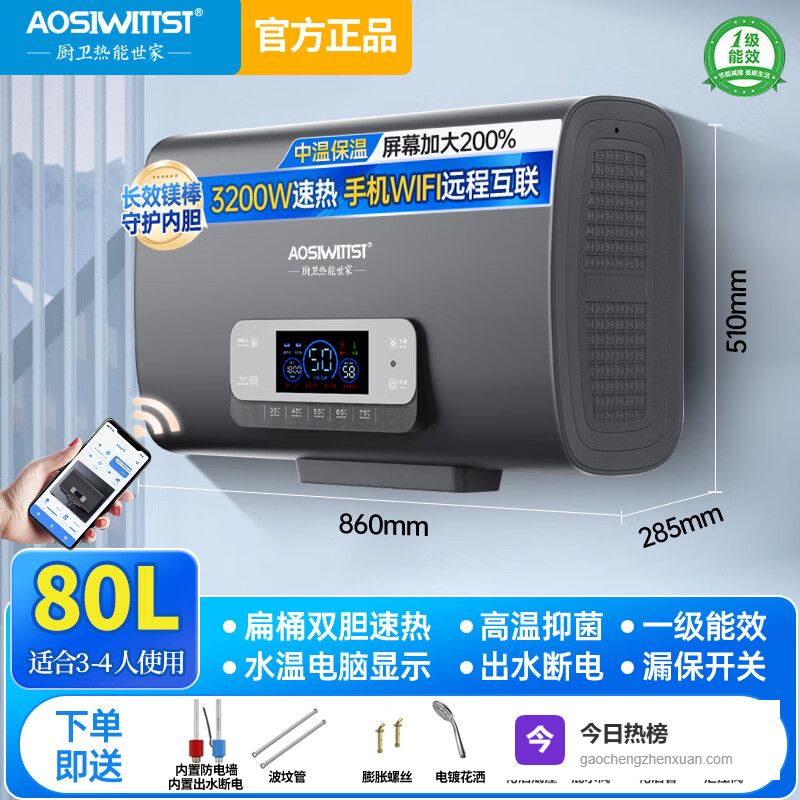 AOSIWITTST【上门安装】电热水器家用洗澡50L60升80卫生间一级能效 80L 3200W 大屏液晶WIFI+出水断电¥