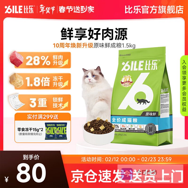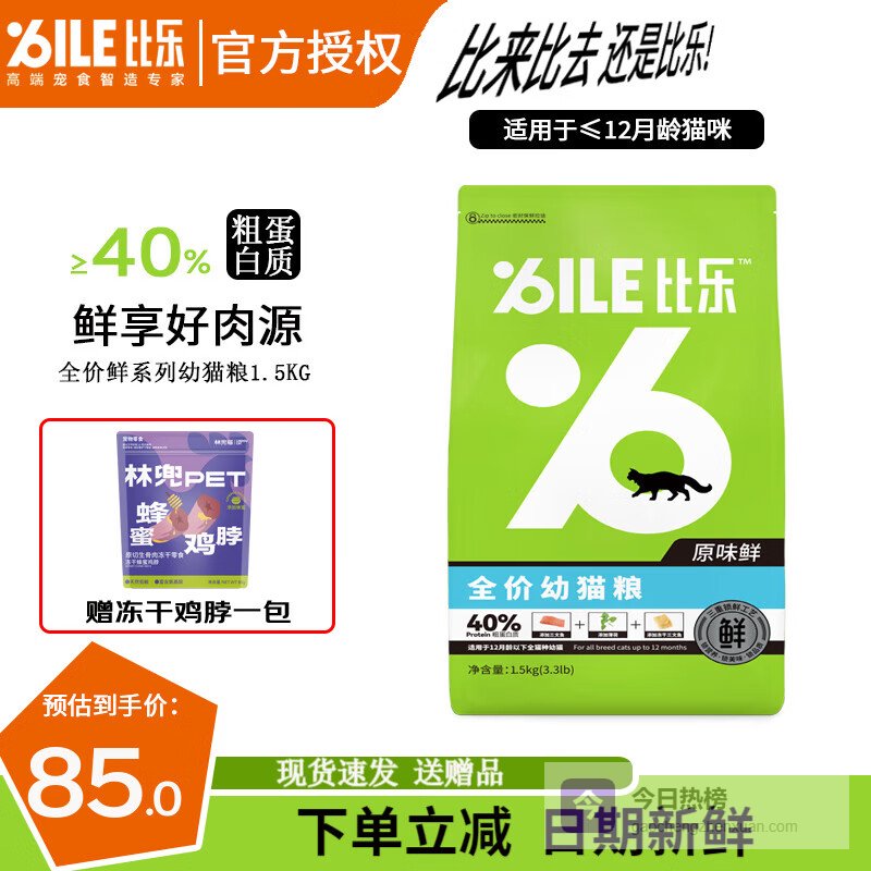 比乐猫粮 原味猫粮 原味鲜系列 低敏无谷 加冻干三文鱼 全猫通用 比乐原味鲜全价幼猫粮1.5kg¥