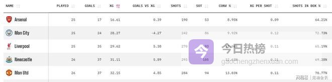 阿森纳的防守质量是英超最好的,本赛季预期丢球只有16.61个,断崖式领先第二名的曼城。