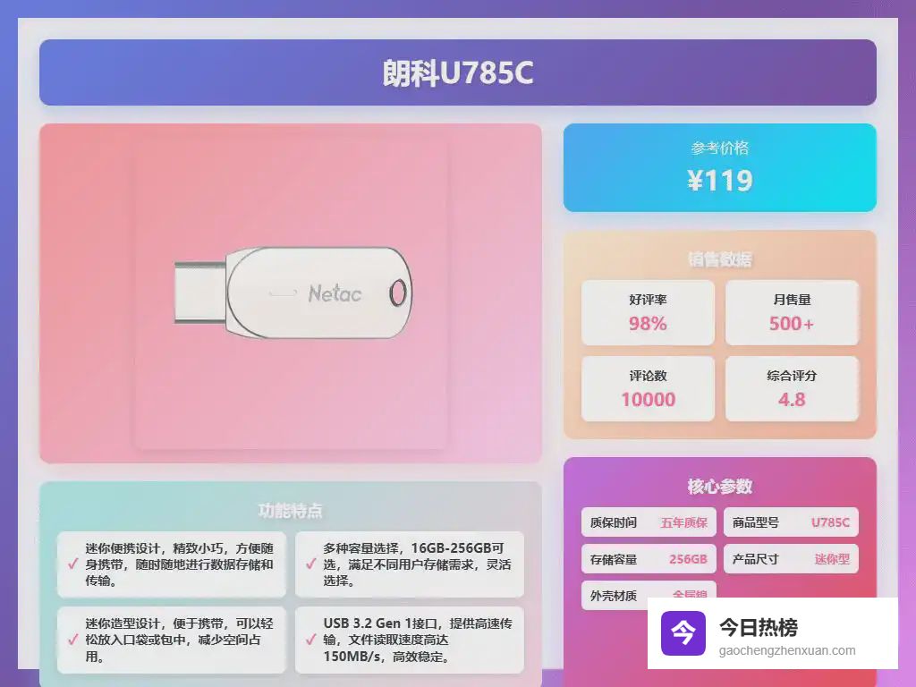 推荐理由:这款朗科U785C采用双接口设计,不仅有USB 3.2接口,还配备了Type-C接口,支持电脑和手机多设备连接,文件传输非常方便。传输速度高达110MB/s,让你传文件不用等太久,效率提升不少。