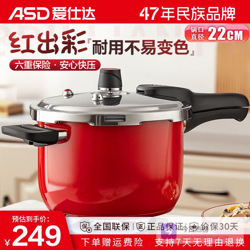 爱仕达(ASD)304不锈钢高压锅家用加厚六保险防爆红色压力锅电磁炉燃气 YS22A7WG 22cm¥