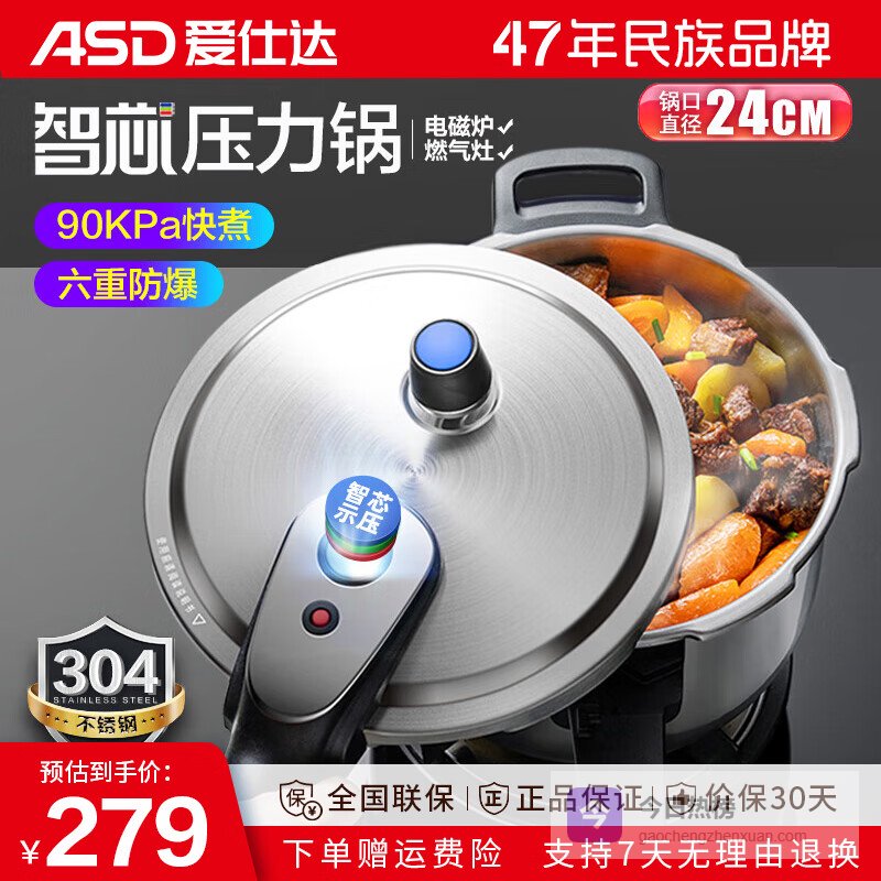 爱仕达(ASD)高压锅 304不锈钢压力锅 电磁炉燃气明火煤气通用家用高压锅 蓝眼智芯YS24D1WG 24cm¥