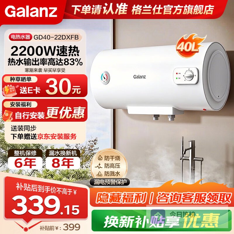 格兰仕热水器家用储水式电热水器机械款速热长效保温加长防电墙出免费上门安装租房洗澡 40L 2200W 安全速热【出租房力荐】¥