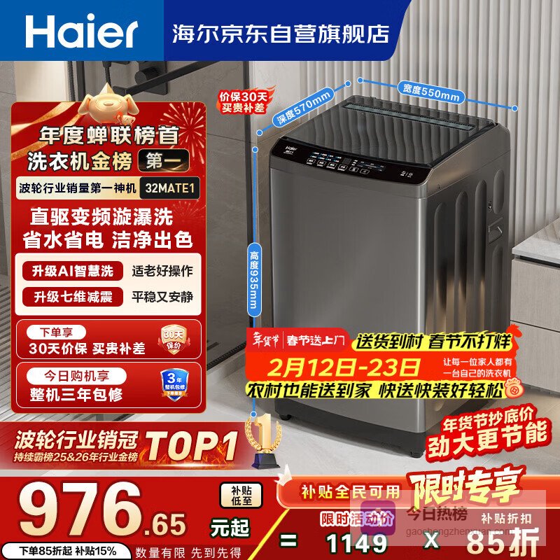 【京东自营】海尔全自动波轮洗衣机10KG直驱变频家用宿舍一级能效家电国家补贴以旧换新京东自营EB10¥