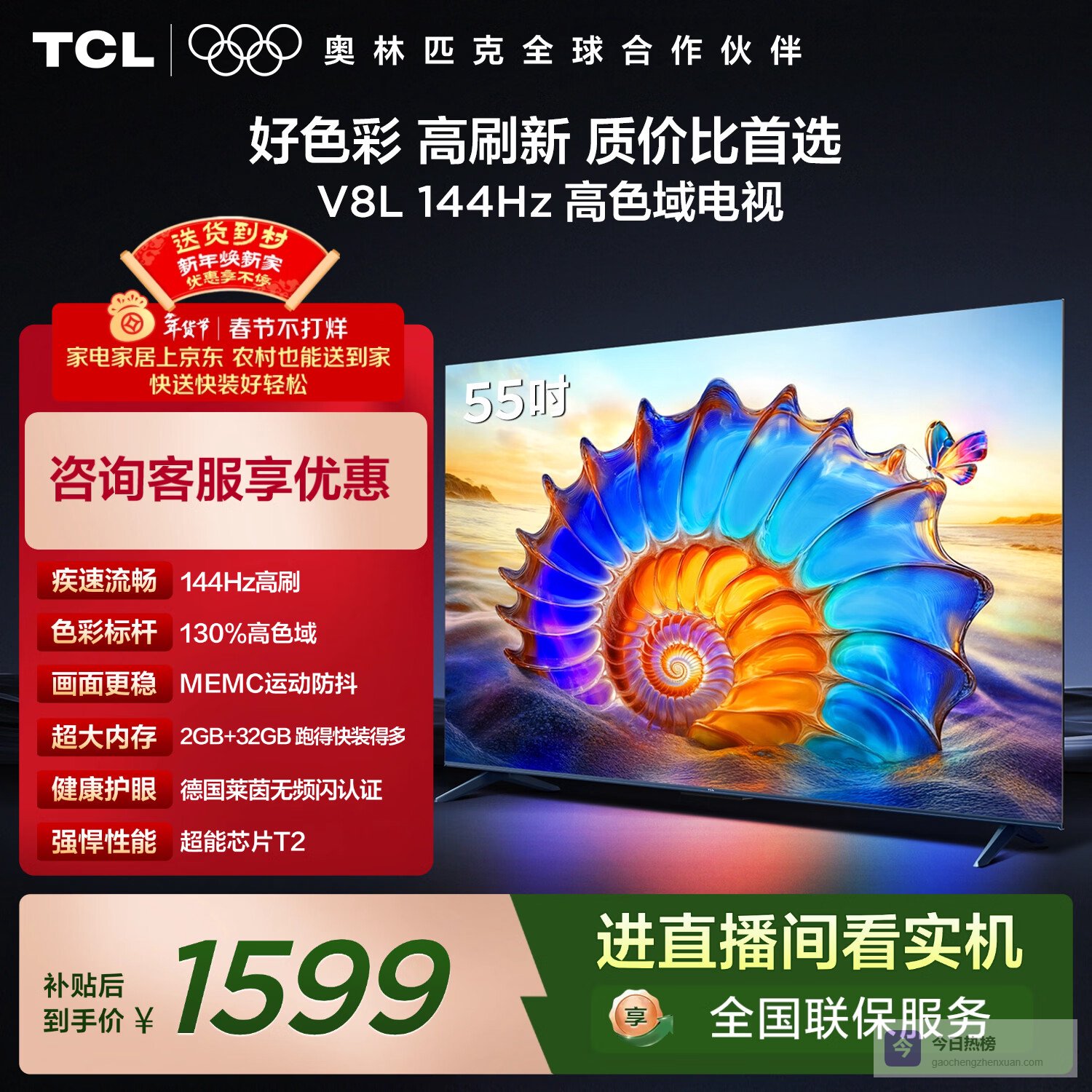 TCL电视 55V8L 55英寸 144Hz 高色域 MEMC防抖 护眼 2GB+32GB大内存 DeepSeek AI电视 国家补贴 护眼¥