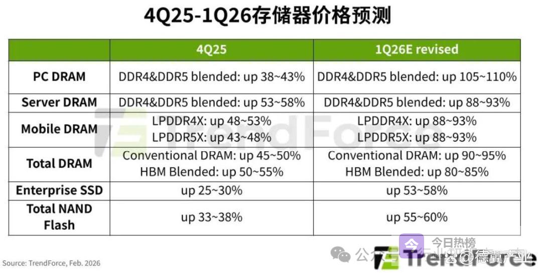 2026年第一季度,常规DRAM合约价预计环比暴涨90-95%,NAND Flash合约价暴涨55-60%。