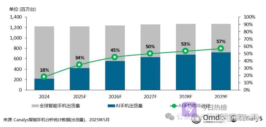 Canalys预测,2025年AI手机渗透率将快速提升至34%,2026年达到45%。