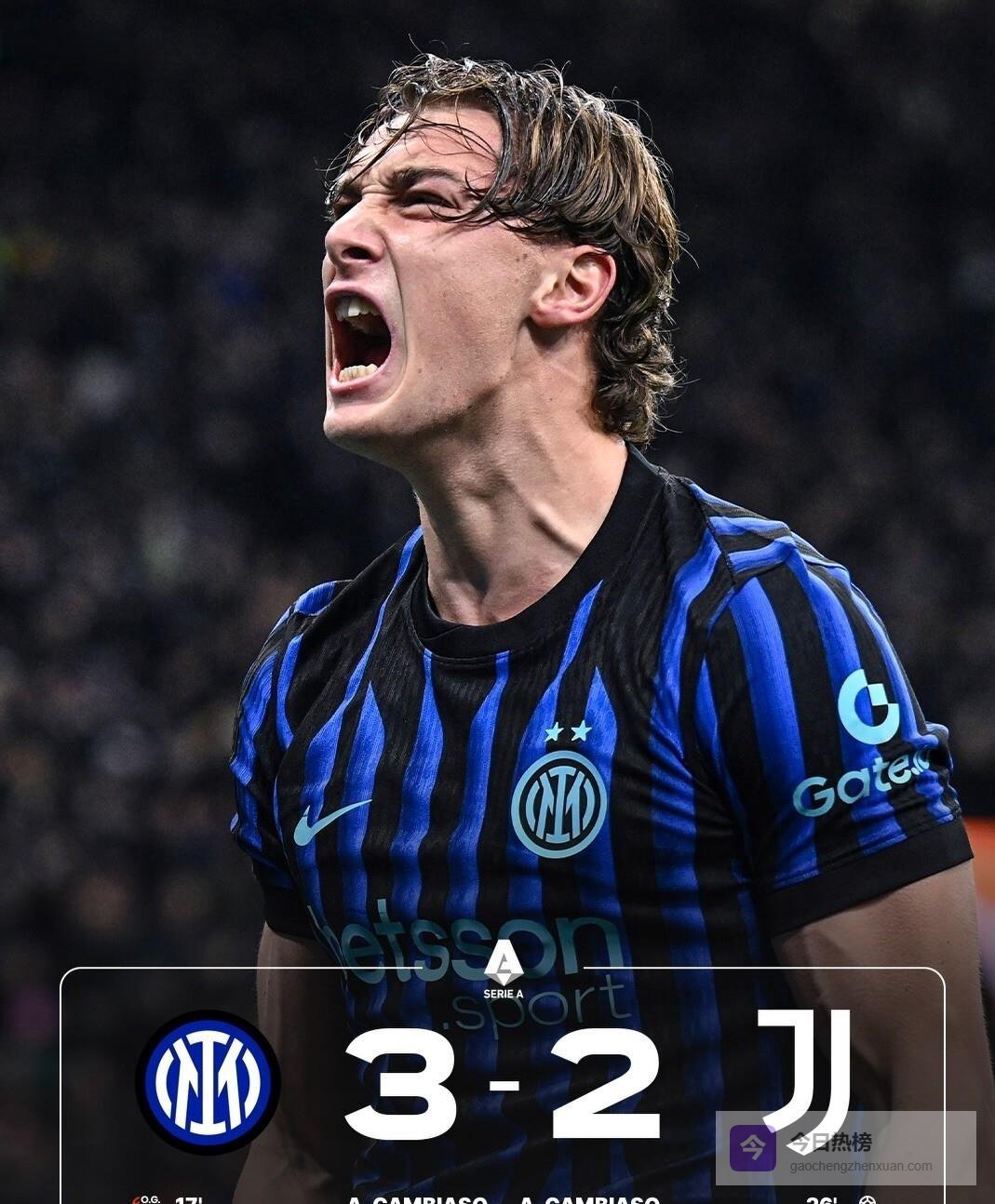第90分钟,比赛进入读秒阶段,国米中场安迪-迪乌夫持球推进后分球,比塞克在右侧得球后再将球传向弧顶。 在那里等候的,正是本场比赛后来被评选为最佳球员的皮奥特·泽林斯基。 这位波兰国脚冷静地停球、调整,然后用他擅长的左脚轰出一记势大力沉的抽射,皮球如出膛炮弹般直窜网窝,尤文门将迪格雷戈里奥对此毫无反应。 3-2! 泽林斯基用一记石破天惊的远射,完成了对死敌的绝杀。 这个进球不仅价值千金,更创造了历史——这是国际米兰在意甲联赛历史上,首次在第90分钟进球并绝杀战胜尤文图斯。