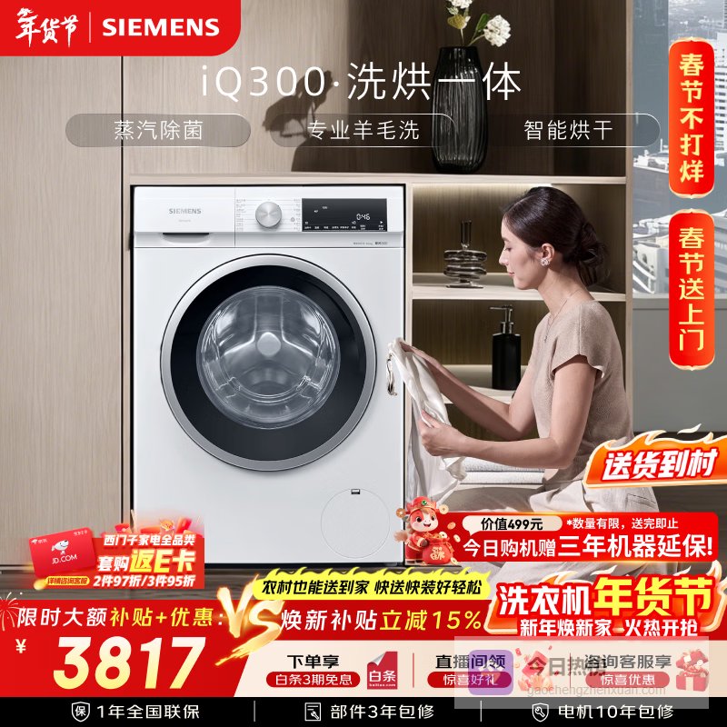 【京东自营】西门子iQ30010KG大容量全自动滚筒洗衣机自带烘干洗烘一体蒸汽除菌羊毛洗智能烘干WN¥