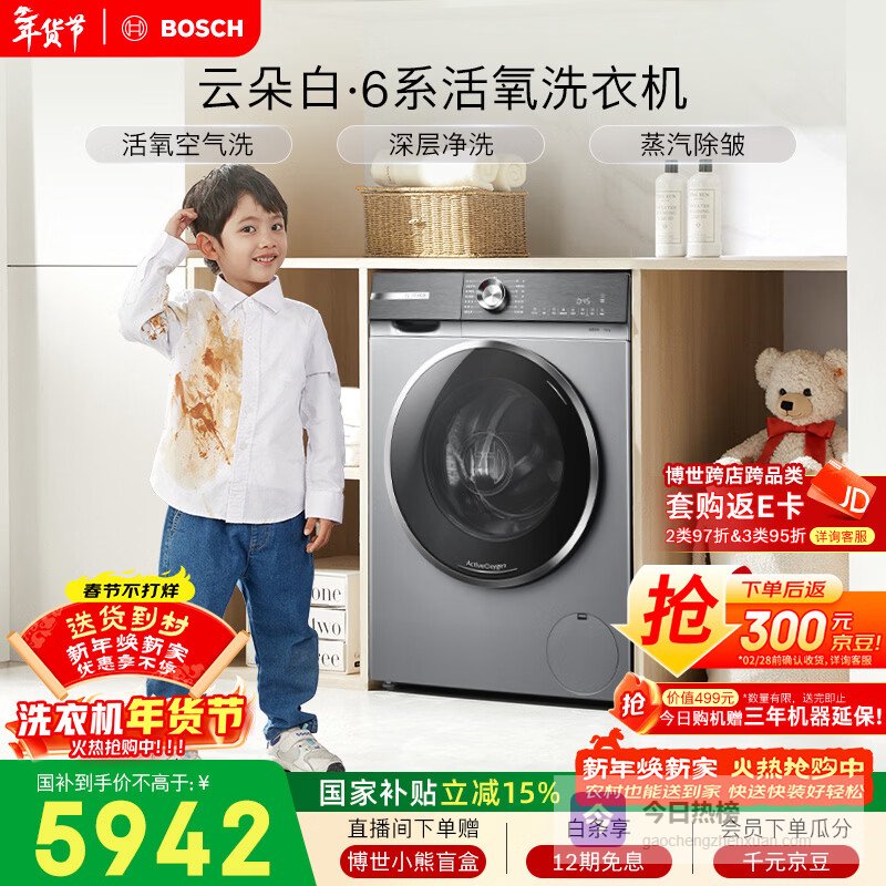 【京东自营】博世云朵白衣物护理中心智能投放99.99%除菌除病毒变频滚筒洗衣机WGA254D80W¥
